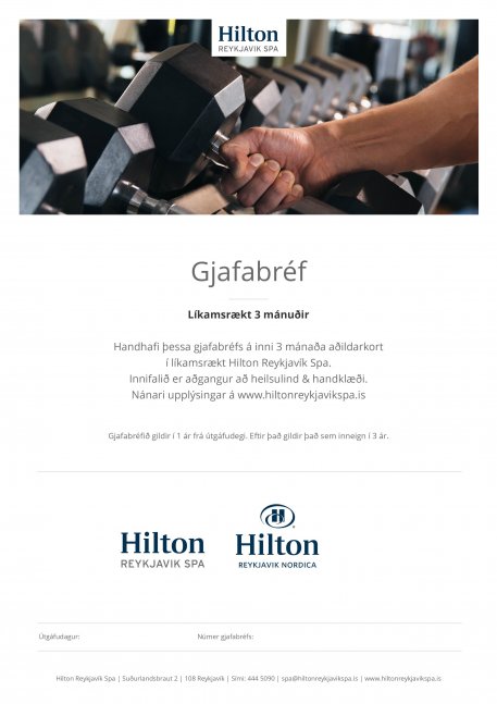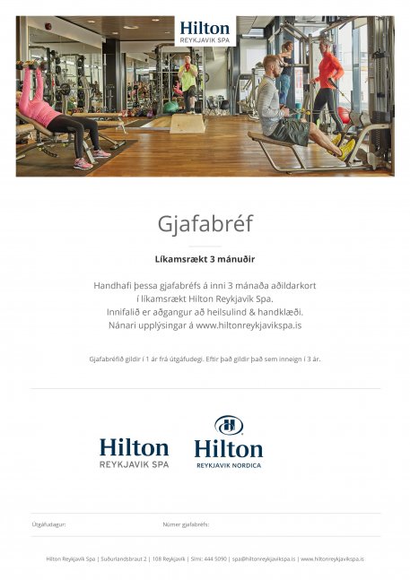 Handhafi þessa gjafabréfs á inni 3 mánaðar aðildarkort í líkamsrækt Hilton Reykjavík Spa.