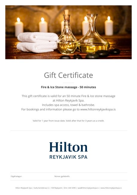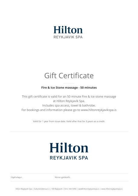 This gift certificate is valid for an 50 minute Fire & Ice stone massage at Hilton Reykjavík Spa.