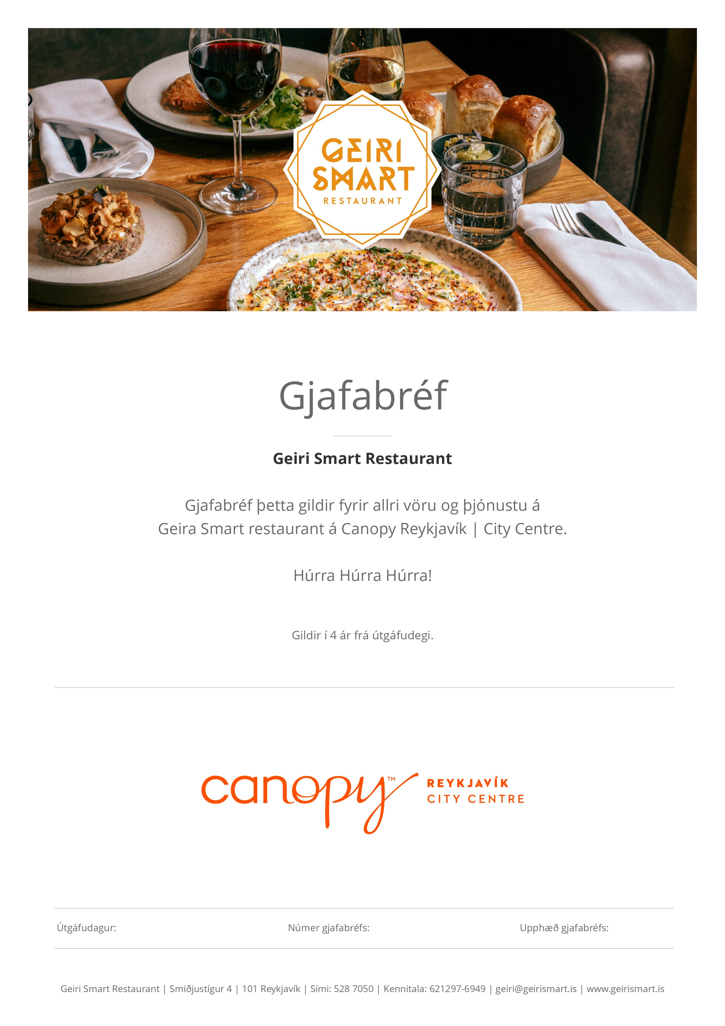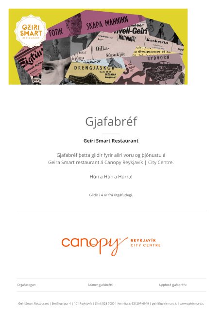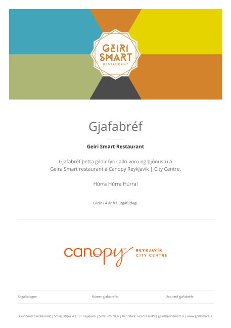 Gjafabréf þetta gildir fyrir allri vöru og þjónustu á Geira Smart restaurant á Canopy Reykjavík | City Centre.