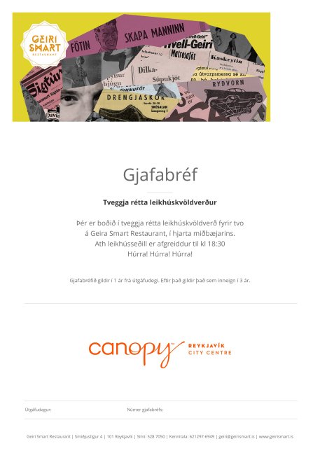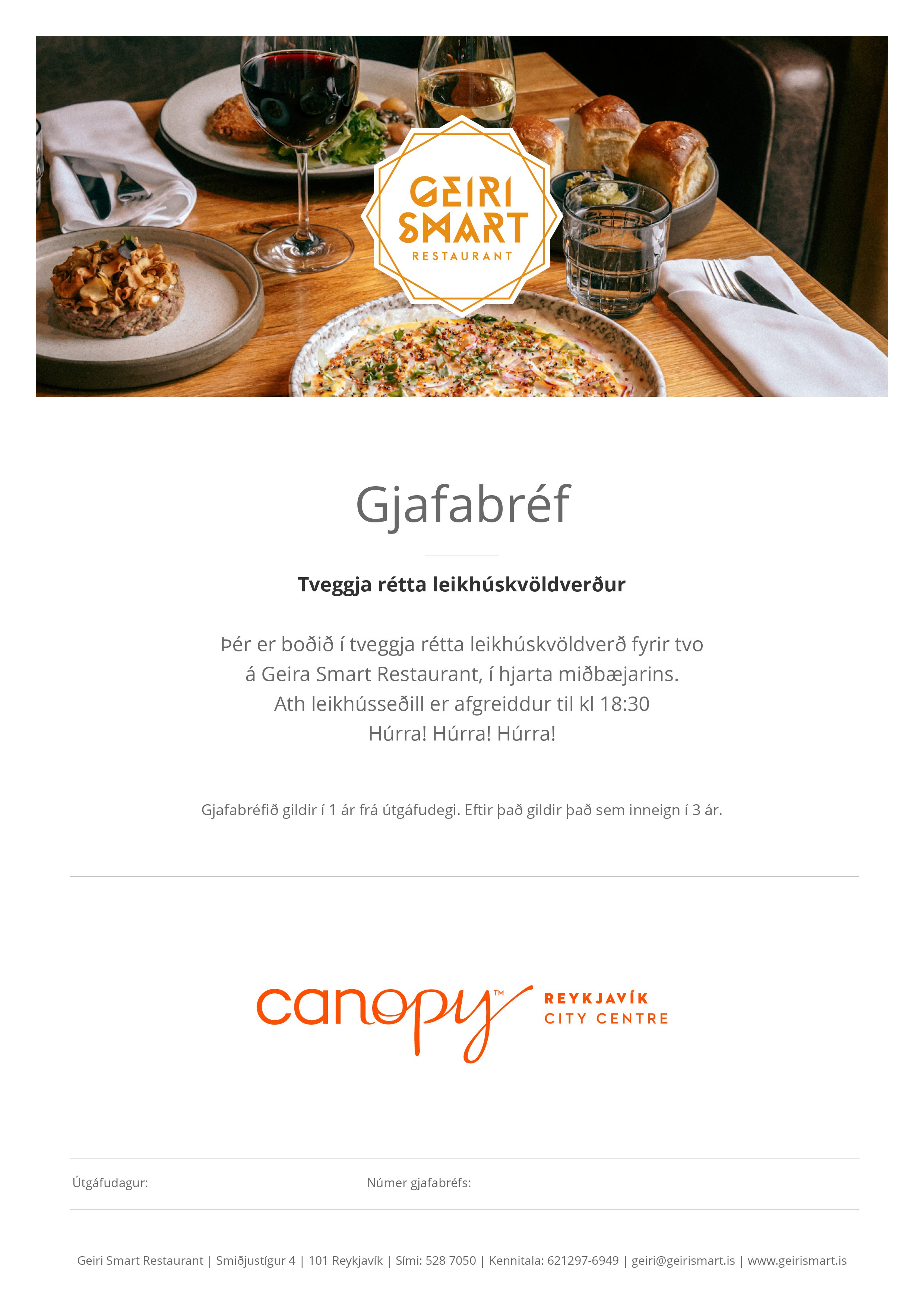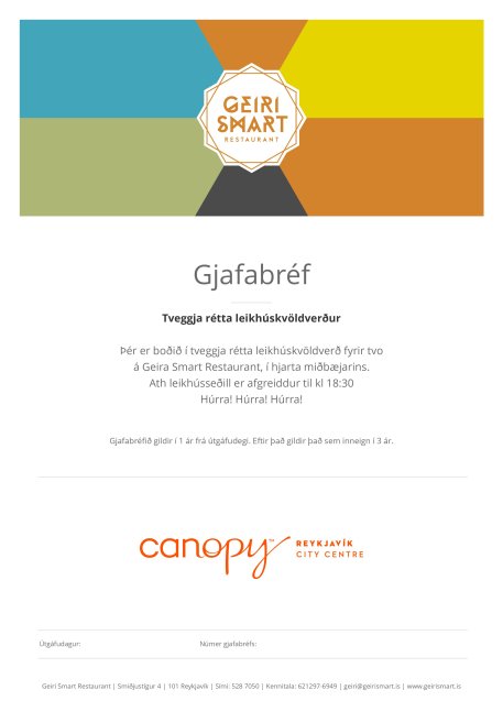 Þér er boðið í tveggja rétta leikhúskvöldverð fyrir tvo á Geira Smart restaurant, í hjarta miðbæjarins. Leikhússeðill er afgreiddur til kl 18:30