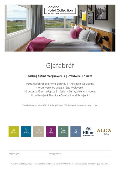 Gjafabréfið gildir fyrir dvöl í tveggja manna herbergi. Hægt er að uppfæra upp í betri herbergi eða fjölskylduherbergi þar sem þau eru til staðar og greiða mismun á herbergjatýpum.