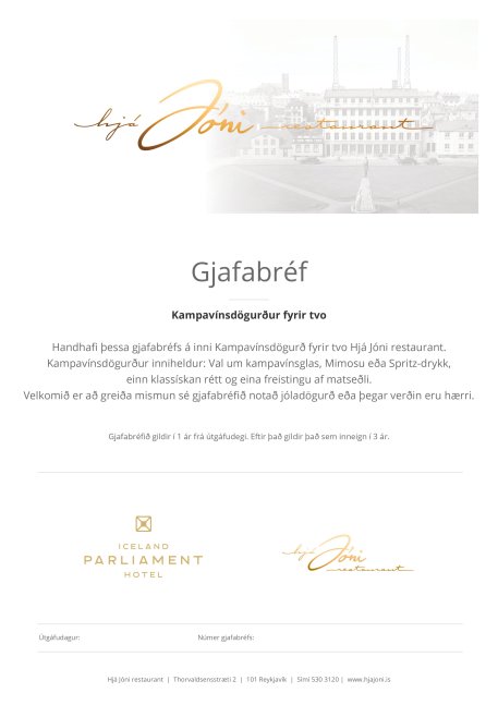 Handhafi þessa gjafabréfs á inni Kampavínsdögurð (Bröns) fyrir tvo Hjá Jóni restaurant.