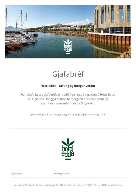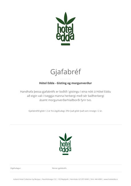 Handhafa þessa gjafabréfs er boðið í gistingu á Hótel Eddu Akureyri eða Hótel Eddu Egilsstöðum í tveggja manna herbergi með sér baðherbergi í eina nótt ásamt morgunverði fyrir tvo.
