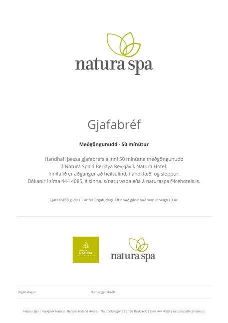Handhafi þessa gjafabréfs á inni 50 mínútna meðgöngunudd á Natura Spa á Berjaya Reykjavík Natura Hotel.