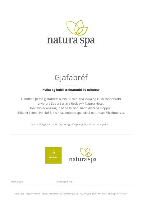 Handhafi þessa gjafabréfs á inni 80 mínútna kvika og kuldi steinanudd á Natura Spa á Berjaya Reykjavík Natura Hotel.