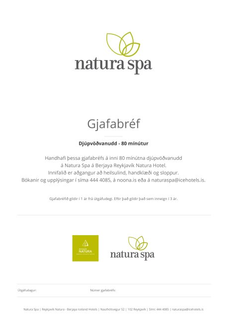 Handhafi þessa gjafabréfs á inni 80 mínútna djúpvöðvanuddá Natura Spa á Berjaya Reykjavík Natura Hotel.