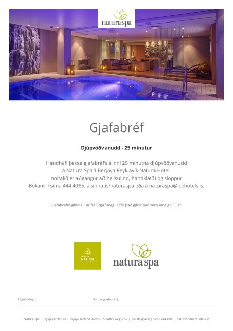 Handhafi þessa gjafabréfs á inni 25 mínútna djúpvöðvanudd á Natura Spa á Berjaya Reykjavík Natura Hotel.