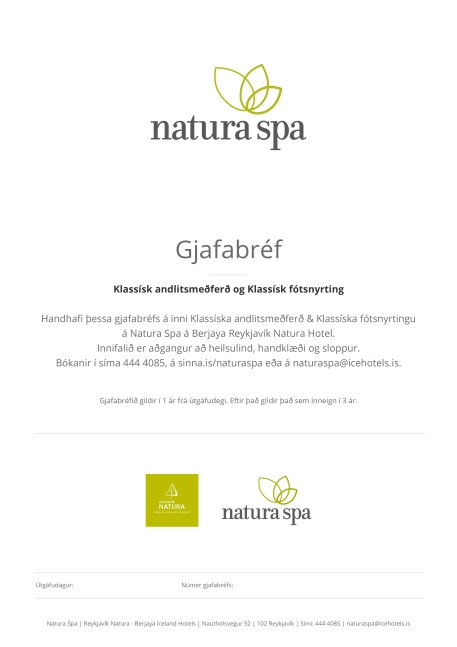 Handhafi þessa gjafabréfs á inni Klassíska andlitsmeðferð og Klassíska fótsnyrtingu á Natura Spa á Berjaya Reykjavík Natura Hotel.