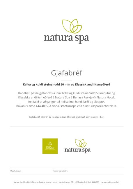 Handhafi þessa gjafabréfs á inni Kvika og kuldi steinanudd 50 mínútur og Klassíska andilitsmeðferð á Natura Spa á Berjaya Reykjavík Natura Hotel.