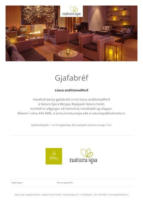 Handhafi þessa gjafabréfs á inni lúxus andlitsmeðferð á Natura Spa á Berjaya Reykjavík Natura Hotel.