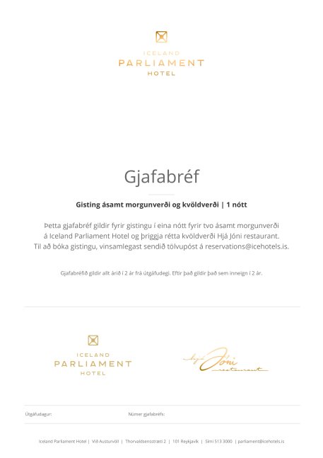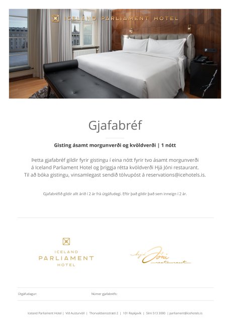 Þetta gjafabréf gildir fyrir gistingu í 1 nótt fyrir tvo ásamt morgunverði og þriggja rétta kvöldverði.