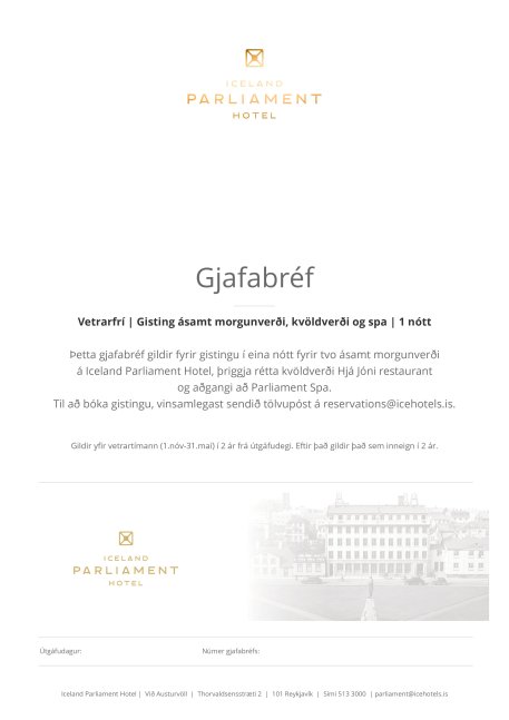 Þetta gjafabréf gildir fyrir gistingu í 1 nótt fyrir tvo ásamt morgunverði, þriggja rétta kvöldverði og aðgangi að Parliament Spa.
