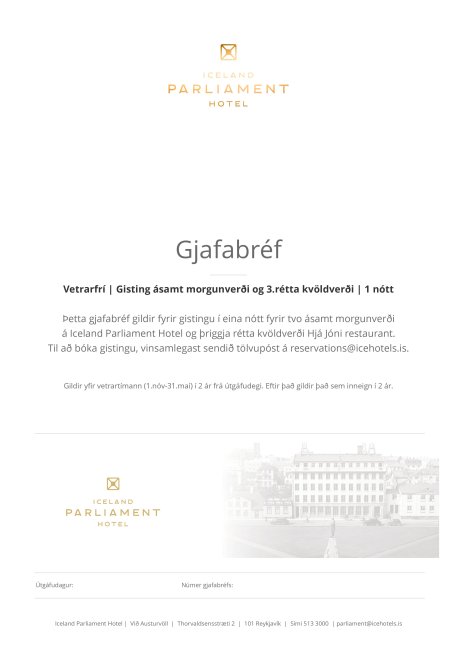 Þetta gjafabréf gildir fyrir gistingu í 1 nótt fyrir tvo ásamt morgunverði og þriggja rétta kvöldverði Hjá Jóni Restaurant