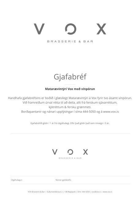 Handhafa gjafabréfsins er boðið í glæsilegt Matarævintýri á Vox fyrir tvo ásamt vínpörun.
