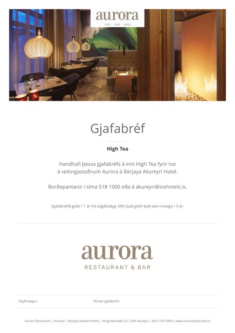 Handhafi þessa gjafabréfs á inni High Tea fyrir tvo á veitingastaðnum Aurora á Akureyri | Berjaya Iceland Hotels
