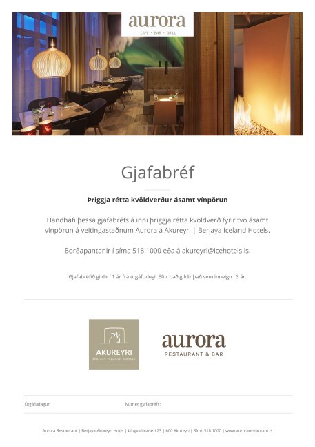 Handhafi þessa gjafabréfs á inni þriggja rétta kvöldverð fyrir tvo ásamt vínpörun á veitingastaðnum Aurora á Berjaya Akureyri hótel.