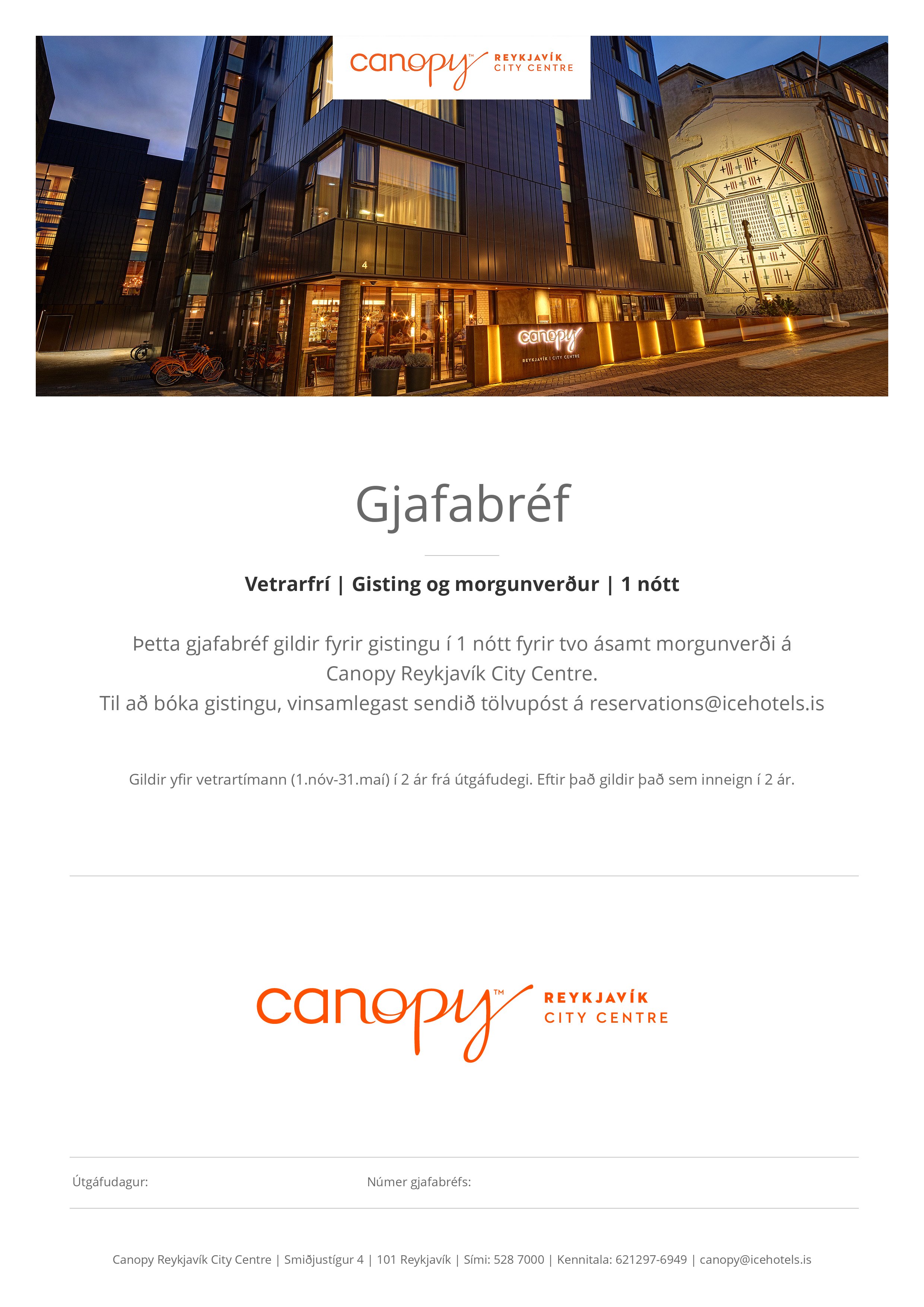 Handhafa þessa gjafabréfs er boðið í gistingu fyrir tvo ásamt morgunverði á Canopy Reykjavík City Centre.