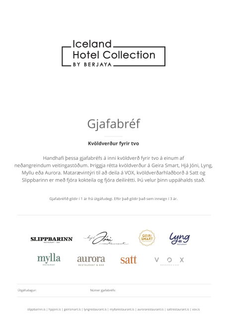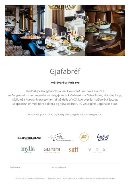Handhafi þessa gjafabréfs á inni kvöldverð fyrir tvo á einum af neðangreindum veitingastöðum: