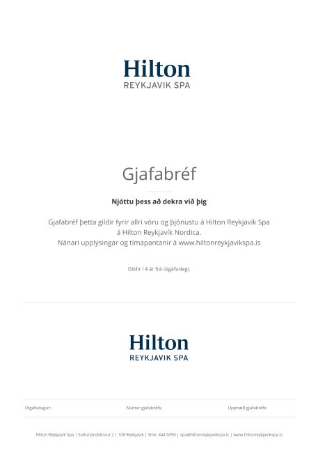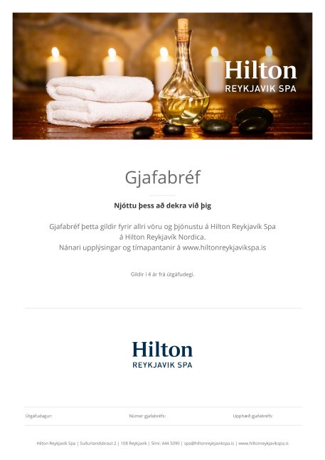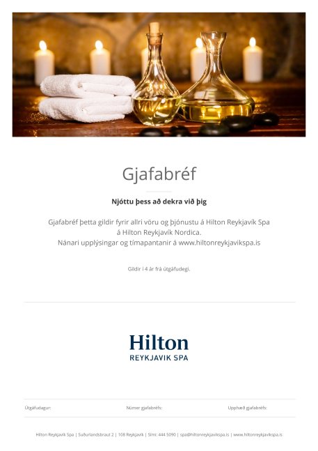 Gjafabréf þetta gildir fyrir allri vöru og þjónustu á Hilton Reykjavík Spa á Hilton Reykjavík Nordica. Hægt er að velja um uppæð á inneignarbréfinu.