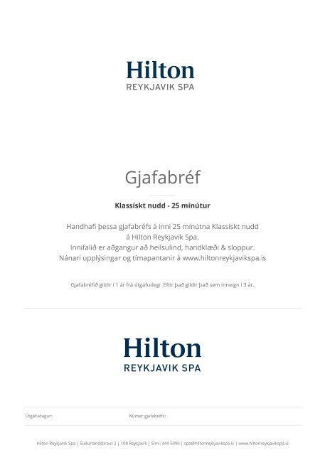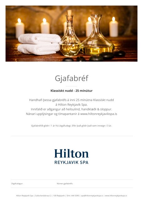 Handhafi þessa gjafabréfs á inni 25 mínútna Klassískt nudd á Hilton Reykjavík Spa á Hilton Reykjavík Nordica.