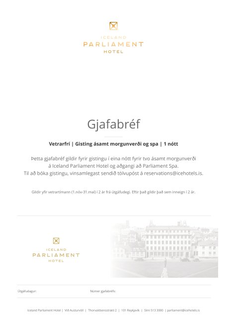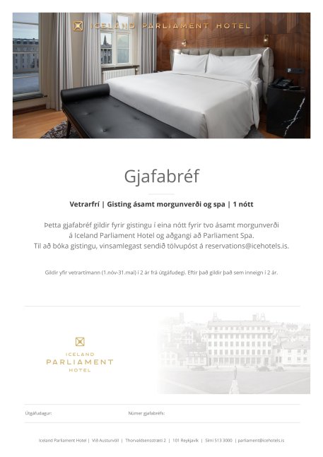 Þetta gjafabréf gildir fyrir gistingu í 1 nótt fyrir tvo ásamt morgunverði og aðgangi að Parliament Spa.