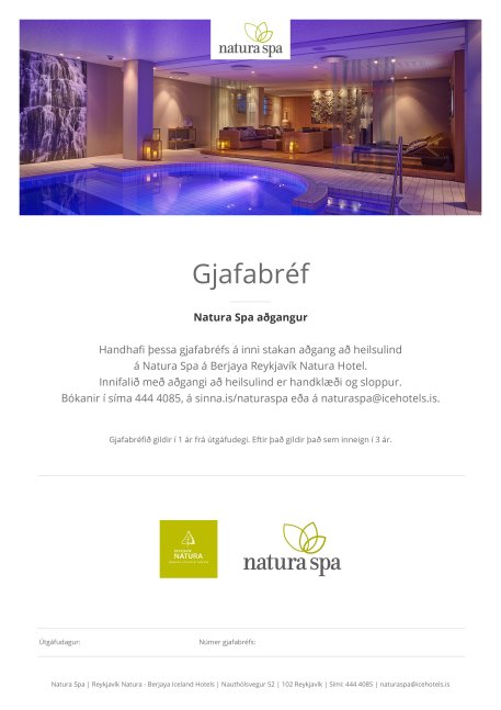 Handhafi þessa gjafabréfs á inni stakan aðgang að baðstofu hjá Natura Spa á Berjaya Reykjavík Natura Hotel.
