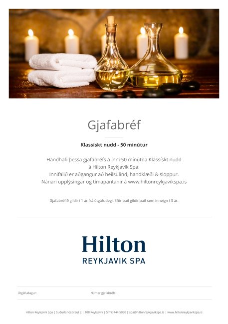 Handhafi þessa gjafabréfs á inni 50 mínútna Klassískt nudd á Hilton Reykjavík Spa á Hilton Reykjavík Nordica.