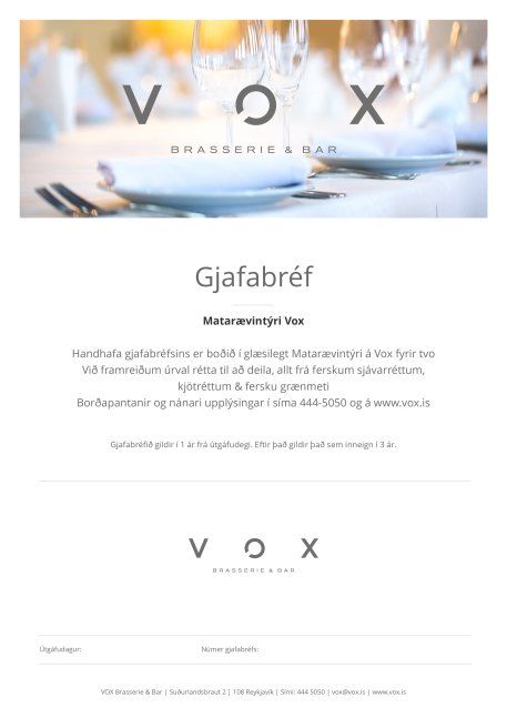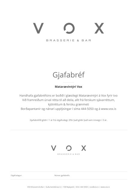 Handhafa gjafabréfsins er boðið í glæsilegt Matarævintýri á Vox fyrir tvo.