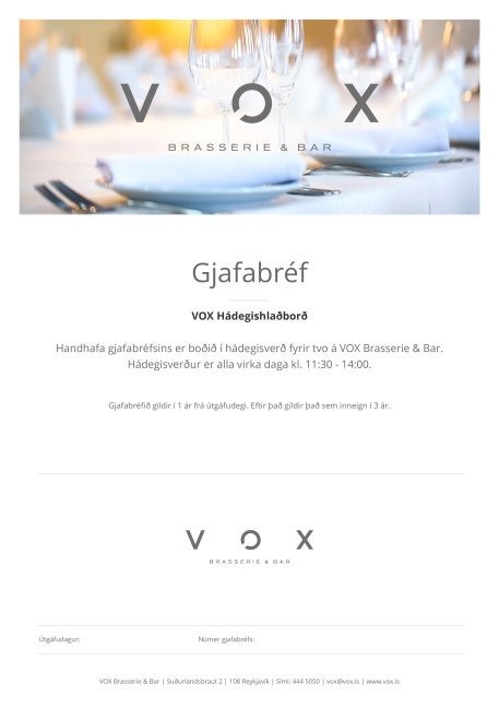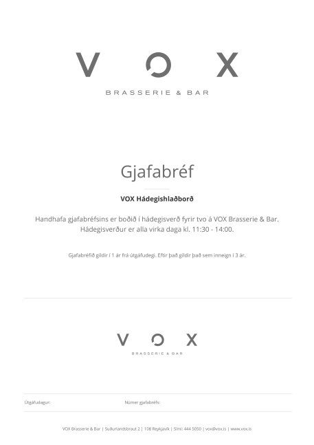 Handhafa þessa gjafabréfs er boðið í hádegishlaðborð á virkum degi fyrir tvo á VOX Restaurant & Bar.